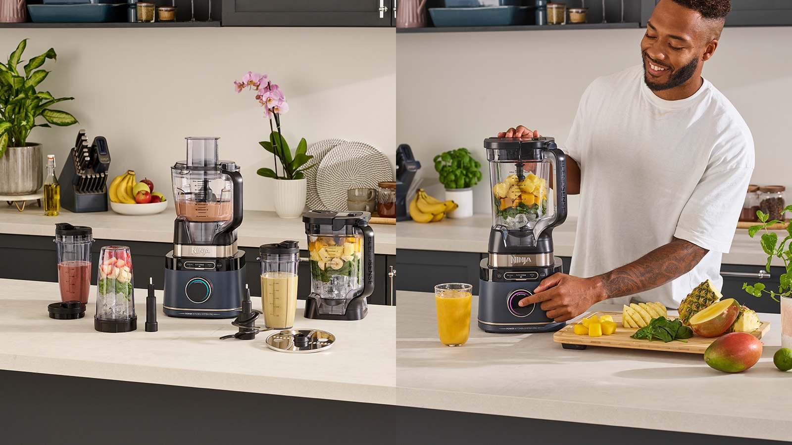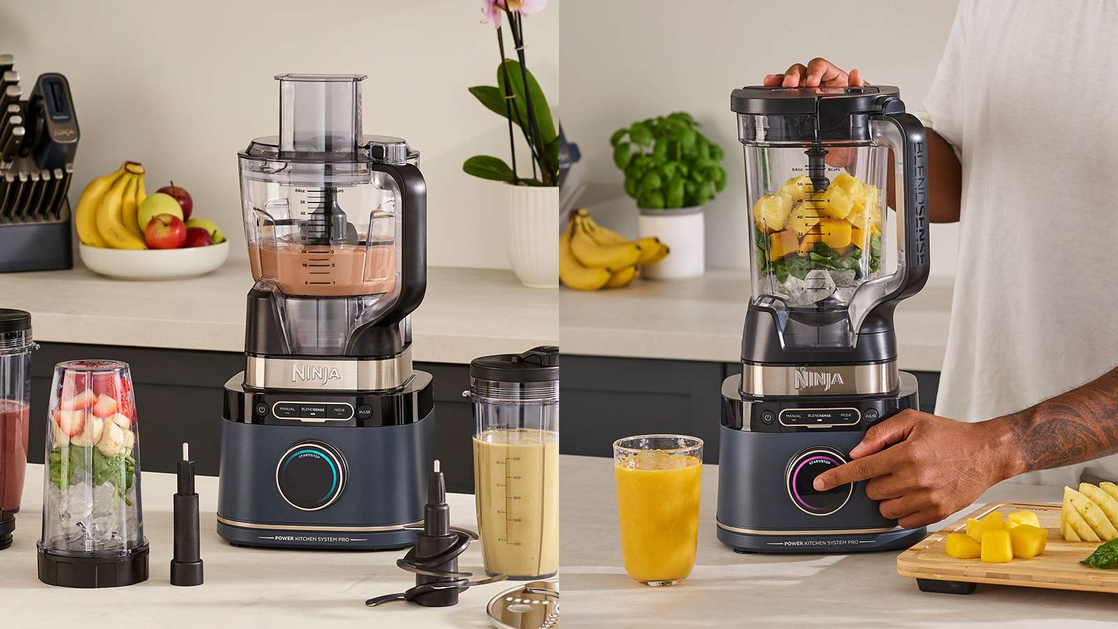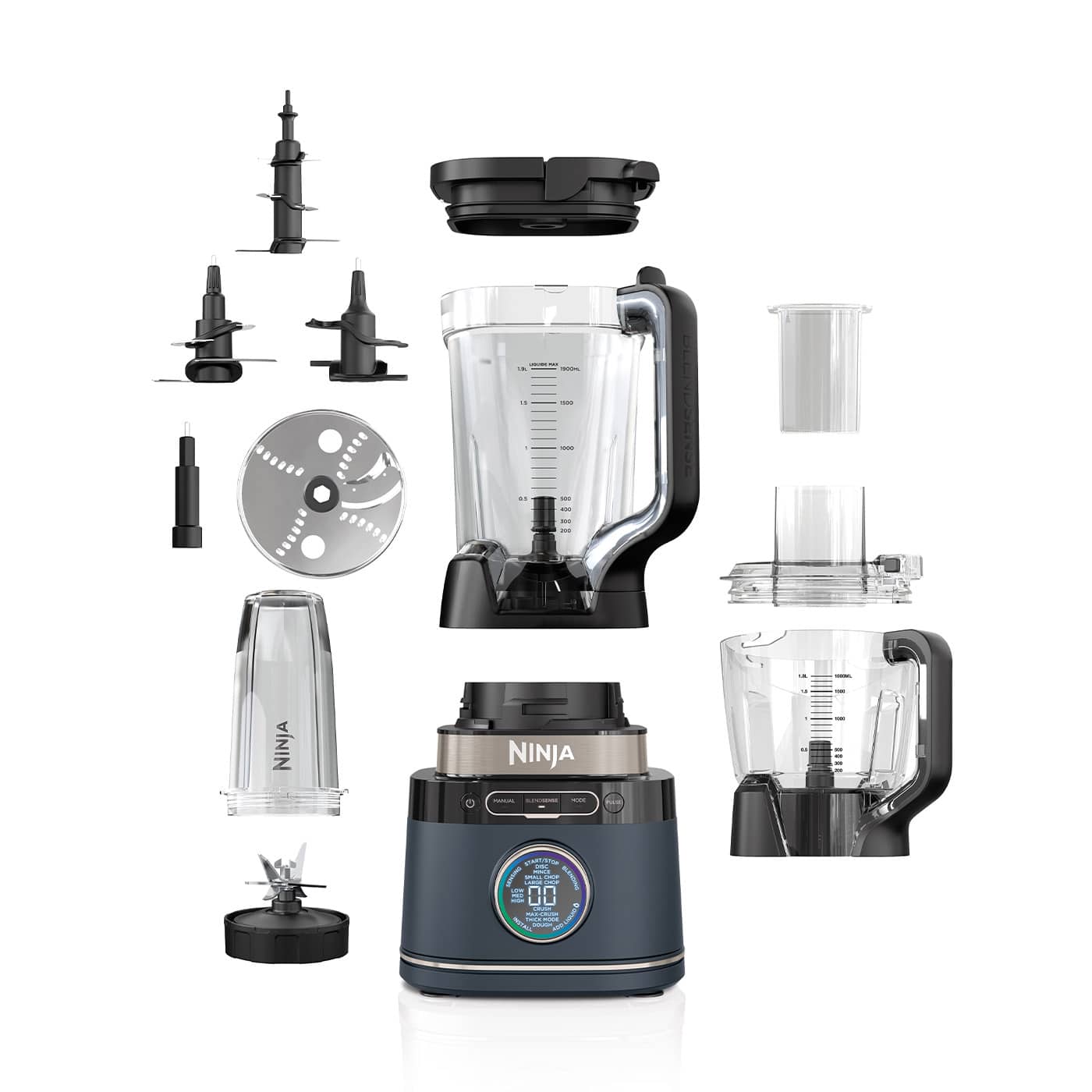 - Inclus : Bloc moteur de 1 200 W, carafe de 2,1 L*, bol de robot de cuisine de 1,8 L***, 3 verres de mixage individuels de 700 ml**, lames Ninja Detect Total Crushing, lame à hacher, lame à pétrir, disque pour trancher/râper, lames Hybrid Edge et livret de recettes