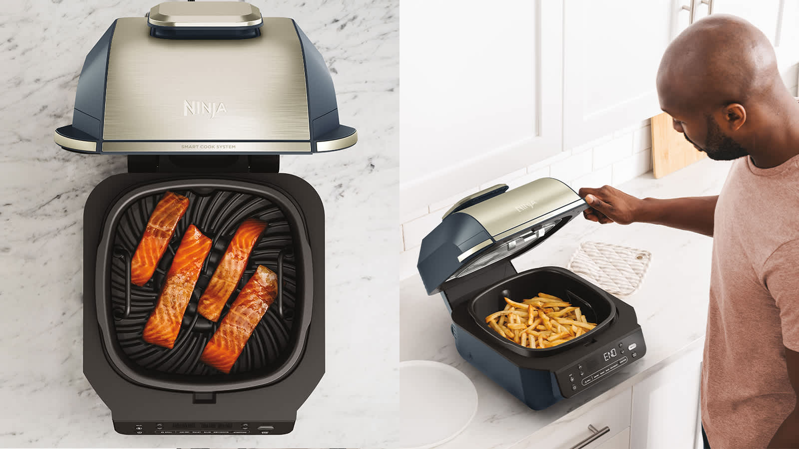Technologie Cyclonic Grill : Alliée à la fonction de grillade à haute température, la technologie Cyclonic Grill de Ninja fait circuler l’air chaud pour une cuisson rapide et homogène, sans besoin de retourner les aliments. Préparez des repas avec une cuisson jusqu’à 50 % plus rapide que dans un four à convection*. De plus, utilisez peu ou pas d’huile avec le mode Air Fry (Frire sans huile), pour déguster des frites en utilisant jusqu’à 75 % d’huile en moins que les méthodes de friture traditionnelles**. Et lorsque vous cuisez à la friteuse sans huile, vous utilisez jusqu'à 50 % d'énergie en moins qu'un four***.