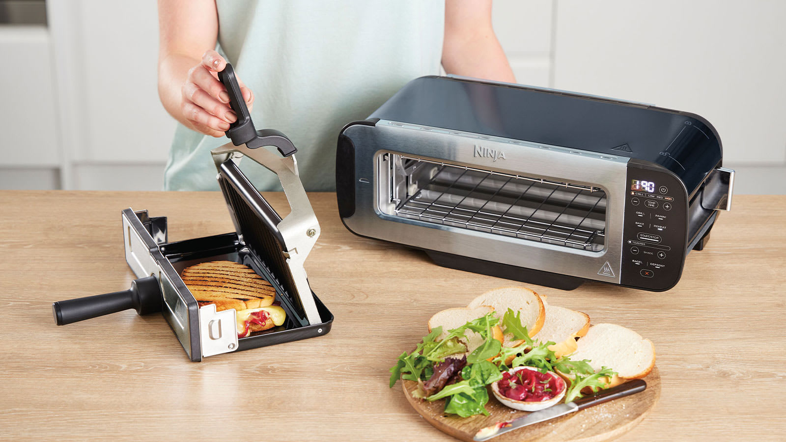 - Inclus : presse à panini, plateau de cuisson, plateau à miettes et guide de recettes créé par le chef.